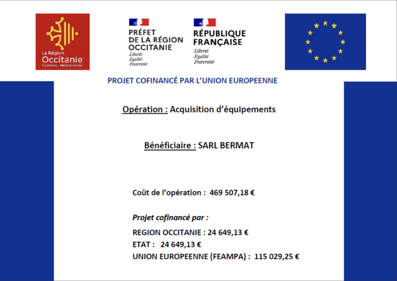 SARL BERMAT a bénéficié du soutien de la Région Occitanie, au titre du dispositif « Fonds Européen pour les affaires maritimes, la pêche et l’aquaculture et de la région Occitanie – FEAMPA », pour réaliser son projet s’intitulant « Acquisition d’équipements ». Ces investissements permettront d’améliorer la performance de l’entreprise par l’automatisation des installations, de renforcer la qualité des produits finis grâce à la gestion des flux et de diversifier la gamme en proposant de nouveaux contenants et formats pour la RHD.